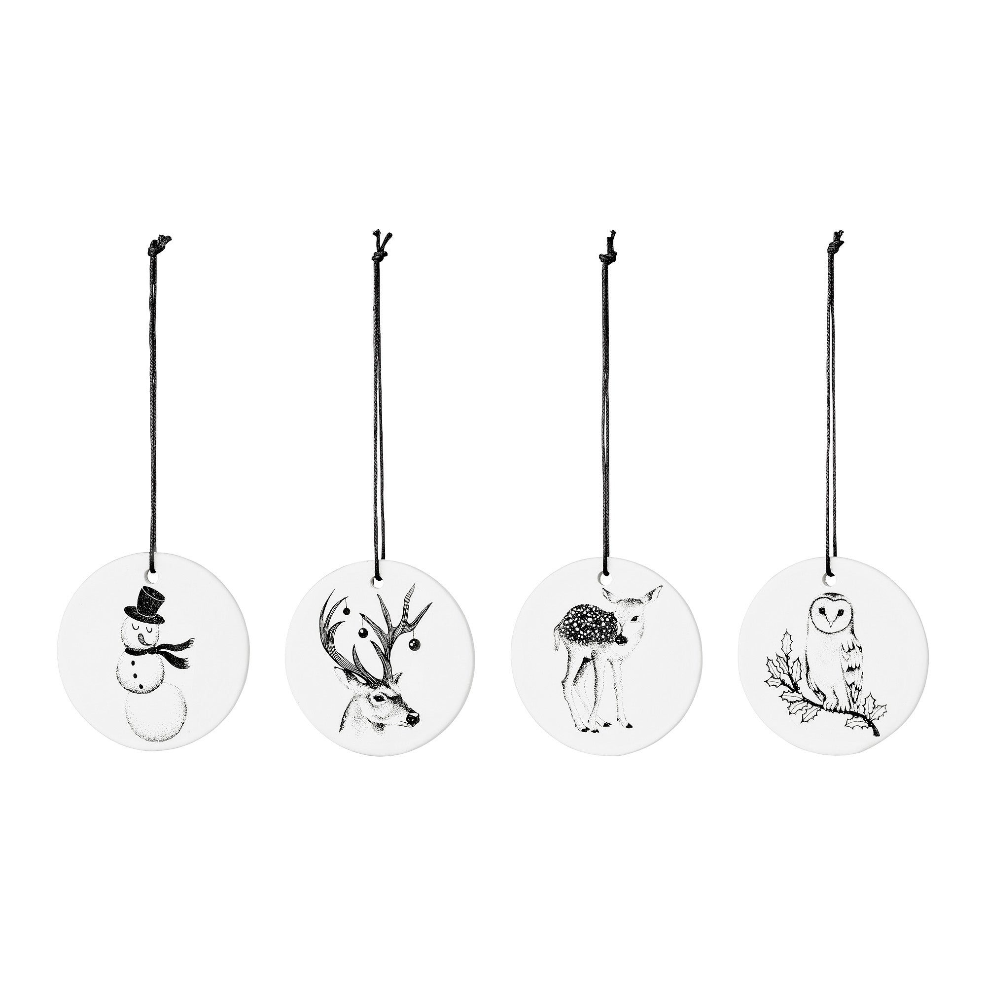 Fine runde til-og-fra gavemærker i hvidt kraftigt papir med sorte tegninger og sort snor. En pakke består af 4 forskellige gavemærker fra Bloomingville Mini.
