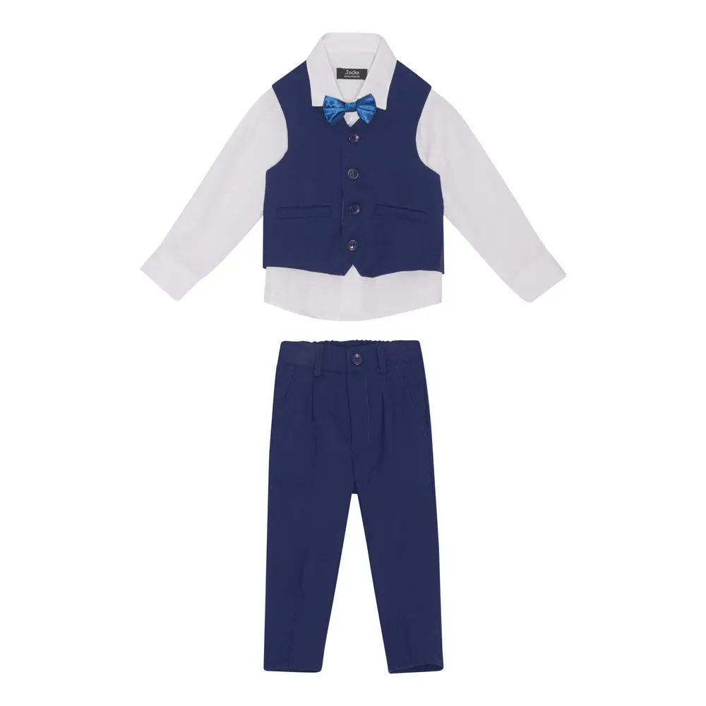 Et super flot 4 delt sæt til den smarte lille dreng eller pige, fra Jocko. Sættet består af en hvid skjorte, en sort vest, sorte bukser og en fin butterfly. Skjorte og vest lukkes med knapper, og bukserne med en enkelt knap og lynl