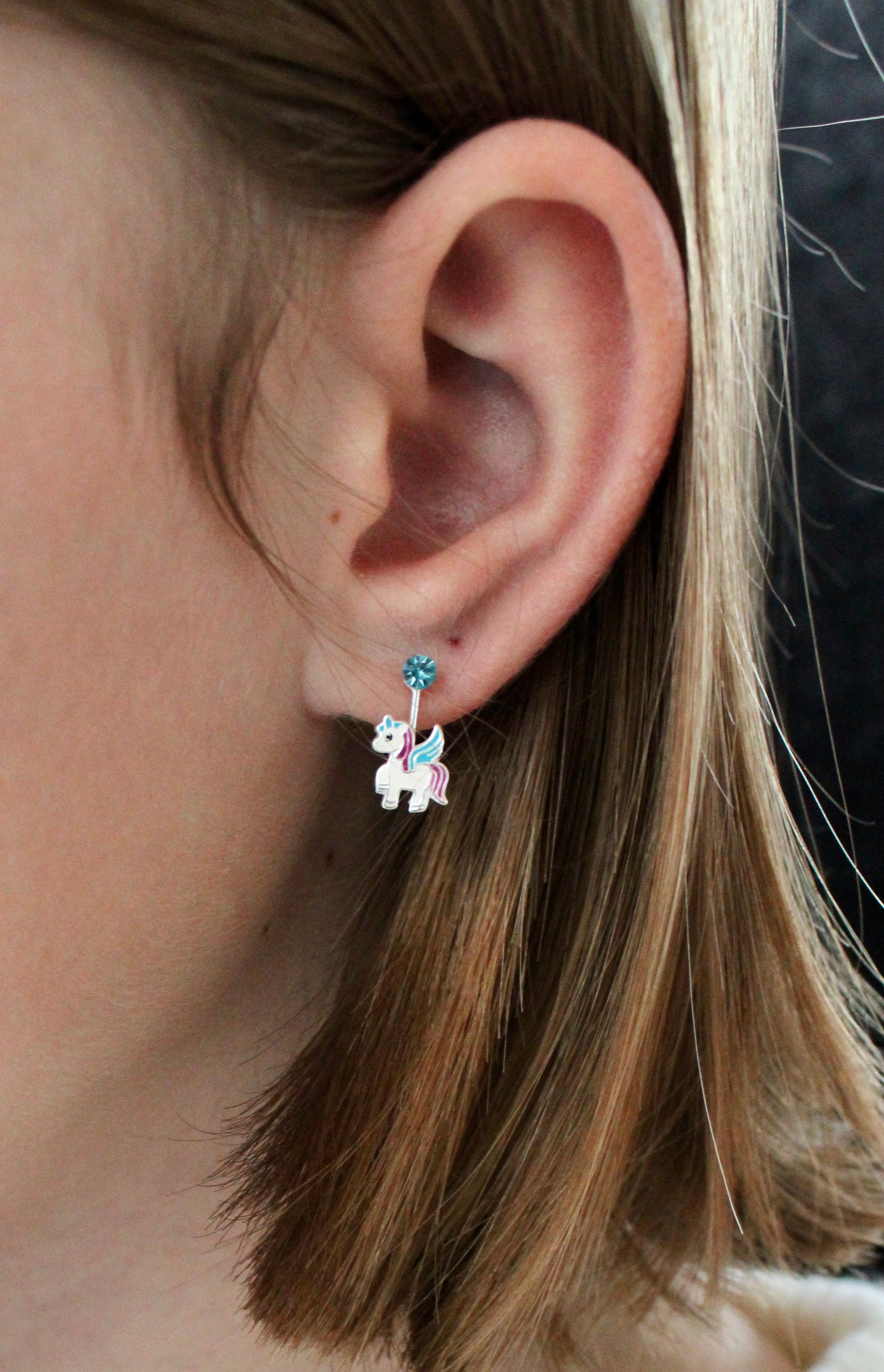 De fine øreringe er af ægte sterling sølv (925 sterling silver) med vedhæng af enhjørning i sølv med emaljebelægning og krystal sten.