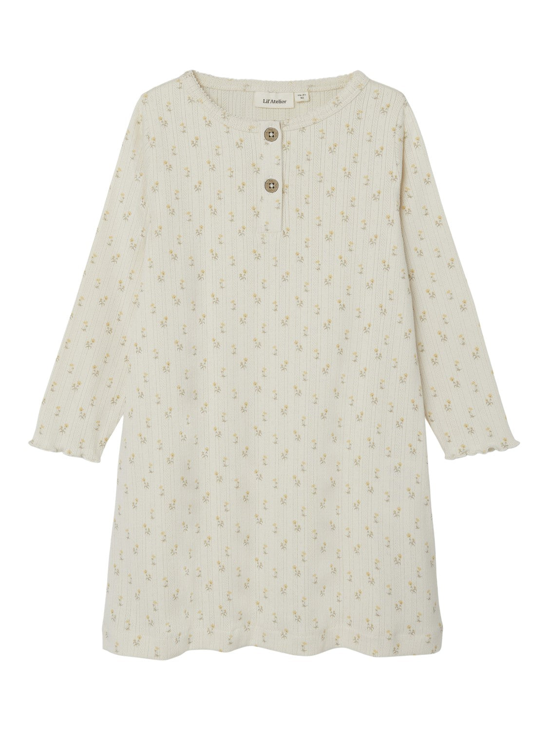 Lil Atelier Lola natkjole har en god og behagelig pasform. Den har A-form og 3 træknapper fortil for lukning.