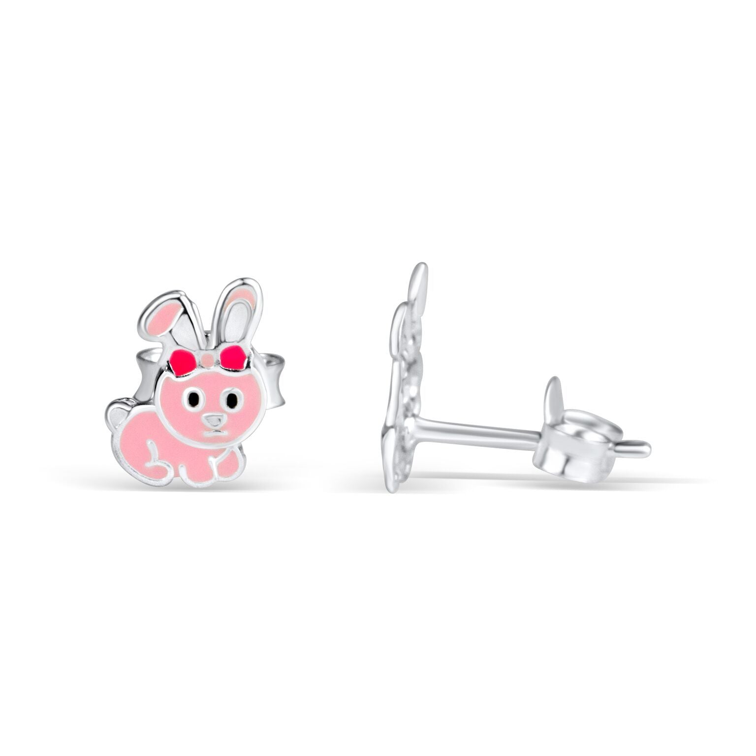 De fine ørestikkere med kaniner er af ægte sølv (925 sterling silver) med emaljebelægning i pink og måler 8 x 6 mm.